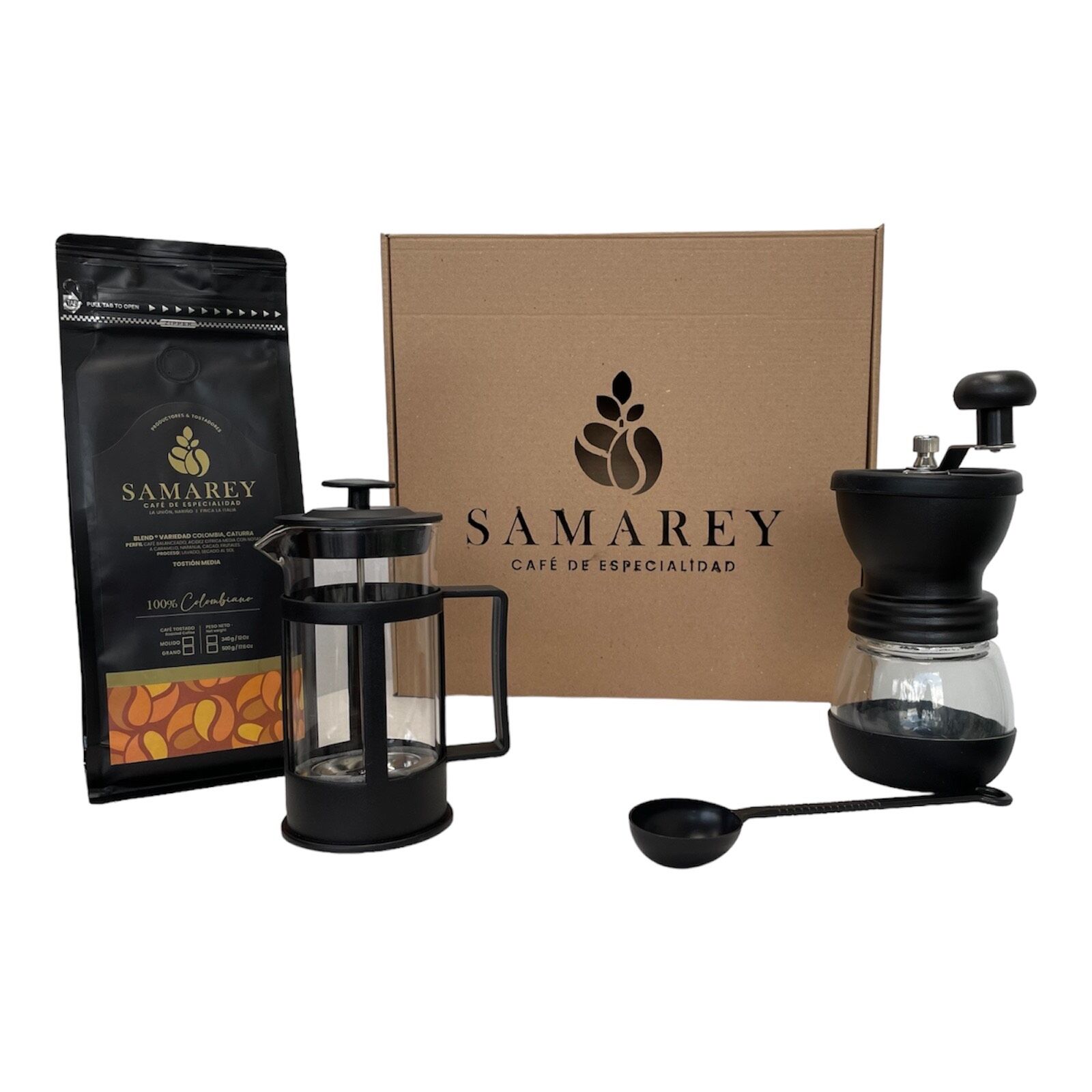 Este kit incluye una prensa francesa de 350 ml , molino manual doble recipiente , 1 bolsa de café Blend de especialidad en grano  y una  cuchara dosificadora de 8-10 gramos.
